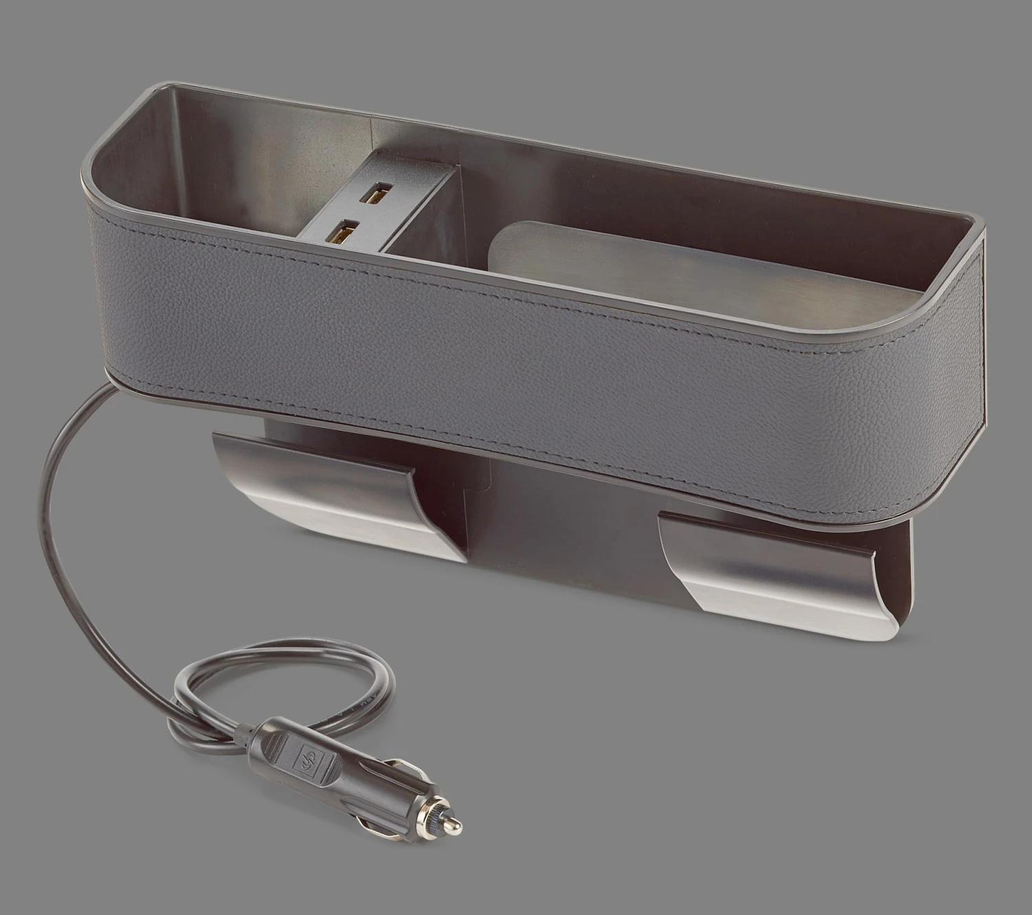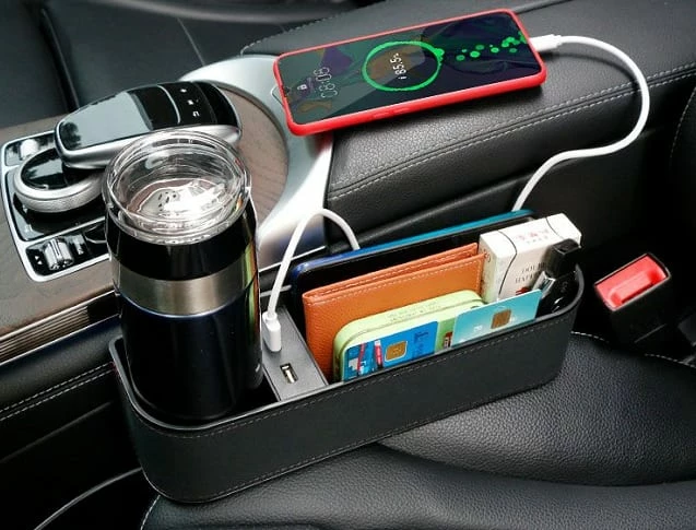 - AutoTrends 12V Seat Wedge Cup Holder features 2 USB charging outputs with a total of 3.1A