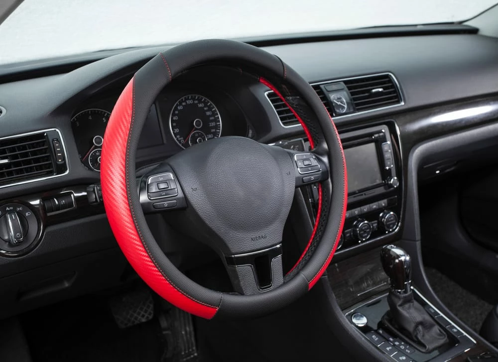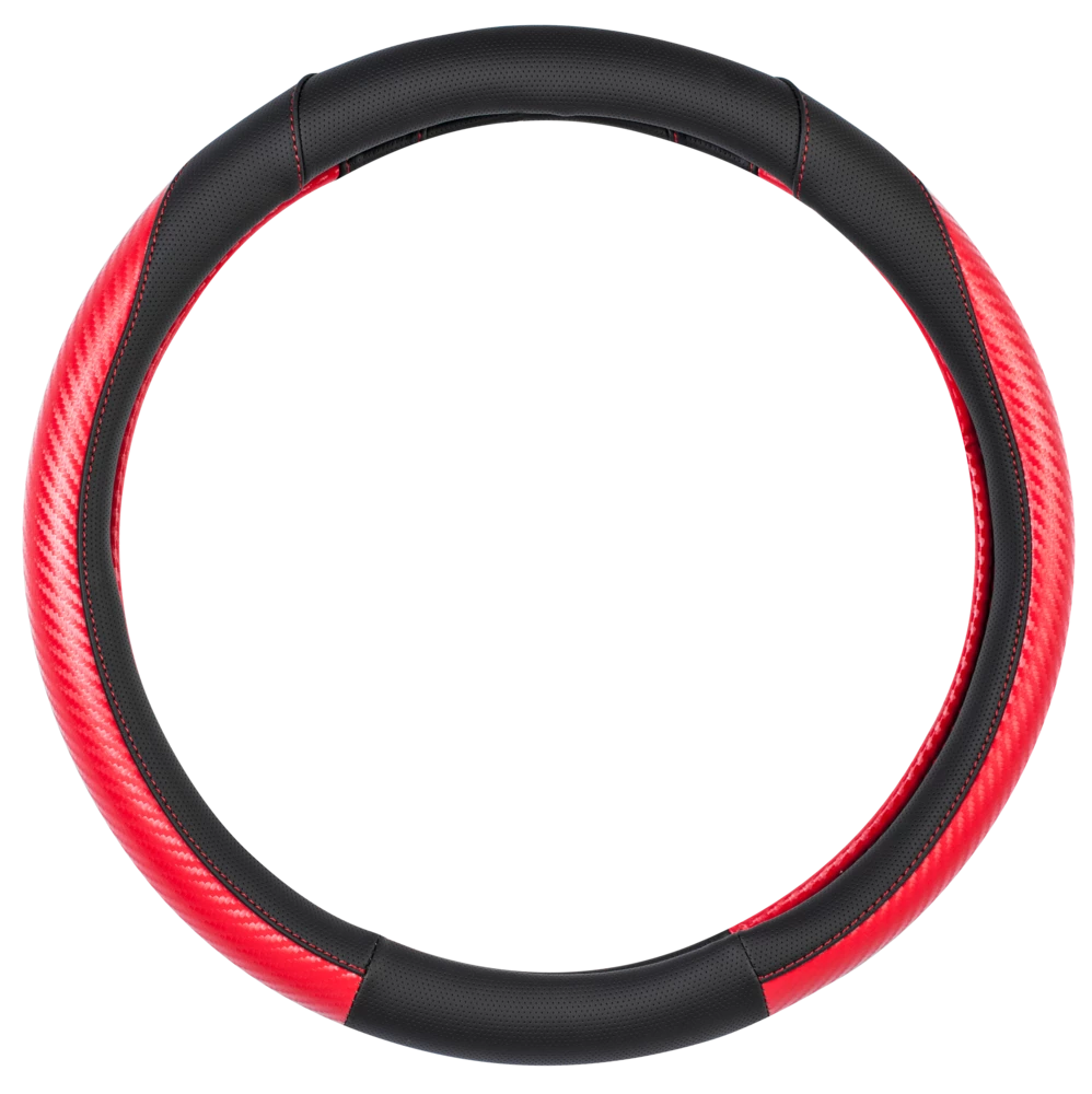 - AutoTrends Red Carbon Steering Wheel Cover protects against wear and tear